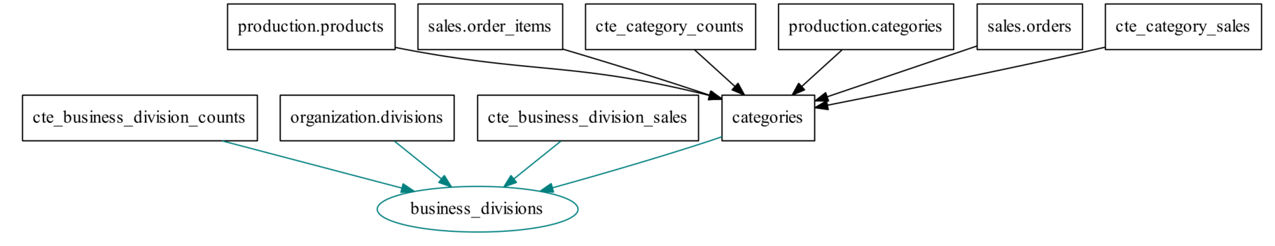 As you can see, there are also ways to highlight certain nodes, as well as omitting them from the output. There is also an automatic random assignment of a color to any persistent table and all edges going into the respective node are also color-coded accordingly. Nodes that have no downstream dependents within the query are displayed as an ellipse as opposed to a rectangle.